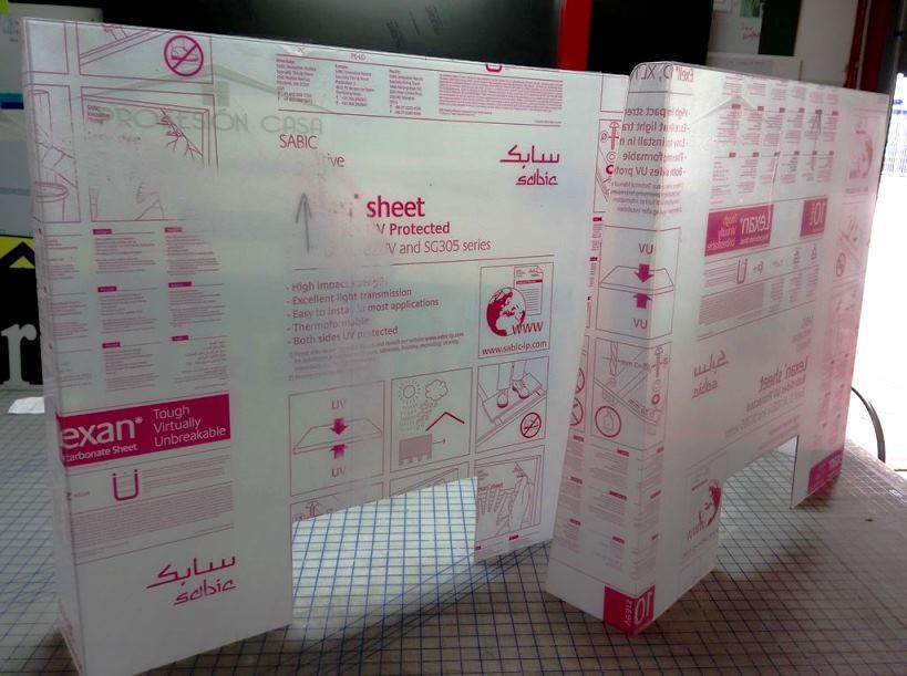 Rótulos del Sur, realiza sus mamparas en policarbonato compacto transparente que es un producto flexible, muy resistente a impactos, duradero y manipulable en frío, lo que permite crear piezas enterizas con alas laterales integradas o con formas adaptadas a mostradores, escritorios e interiores de vehículos.